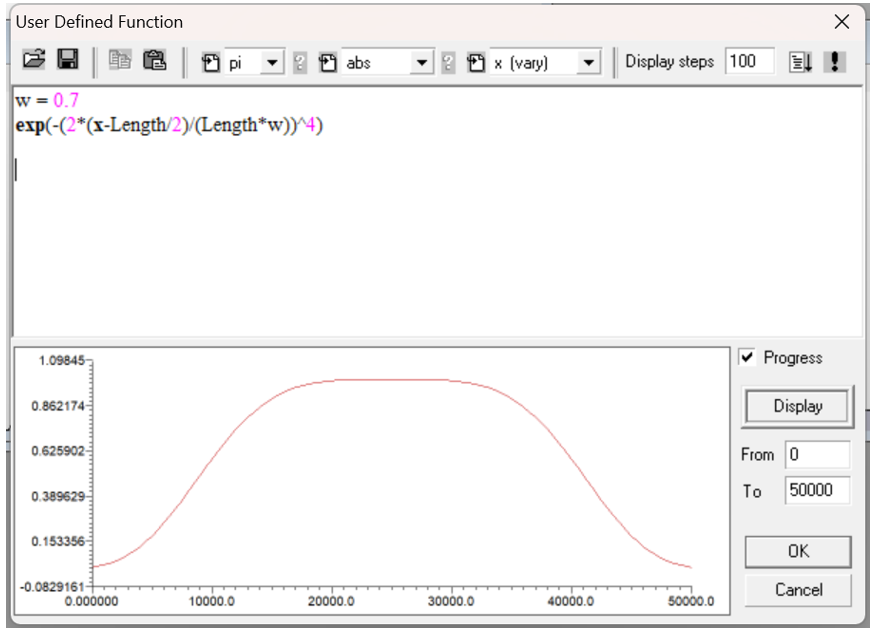 在這一步中,您將學習如何在“User Defined”對話框中編寫函數。“User Defined”對話框允許您使用基本語法對函數進行編程,并通過按下“顯示”按鈕對函數進行可視化測試。在此步驟結束后,您將完成定義光纖布拉格光柵的所有必要參數。