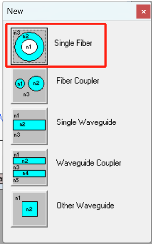 首先新建一個項目。然后,選擇五個可用模塊中的一個來使用: Single Fiber, Fiber Coupler, Single Waveguide, Waveguide Coupler, 和Other Waveguide。