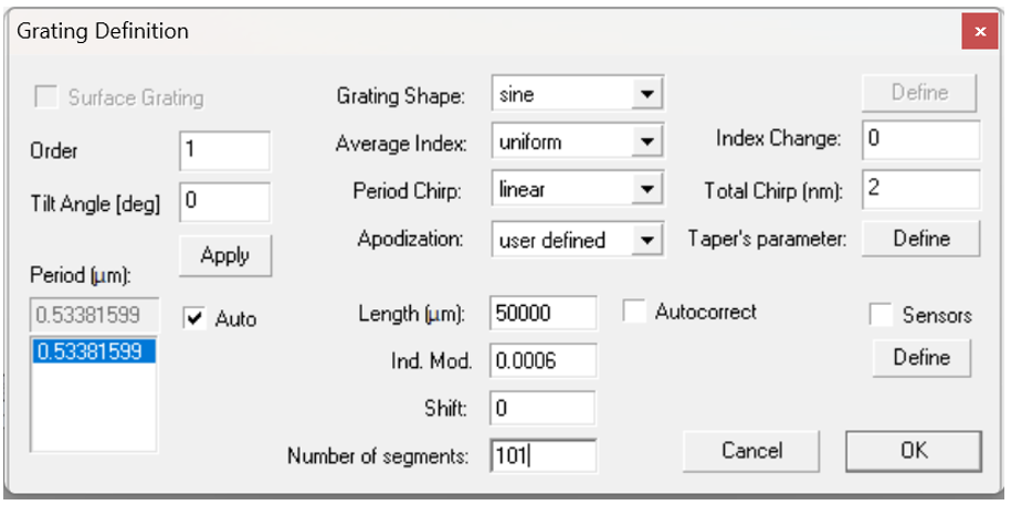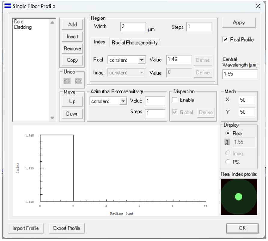 接下來,您將為單個光纖定義某些參數。在“Single Fiber”對話框中,您可以設置以下特性: Index Profile, Photosensitivity Profile, Number Of Points In Mesh, Central Wavelength等。