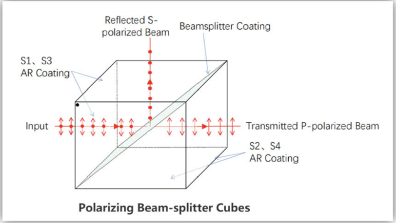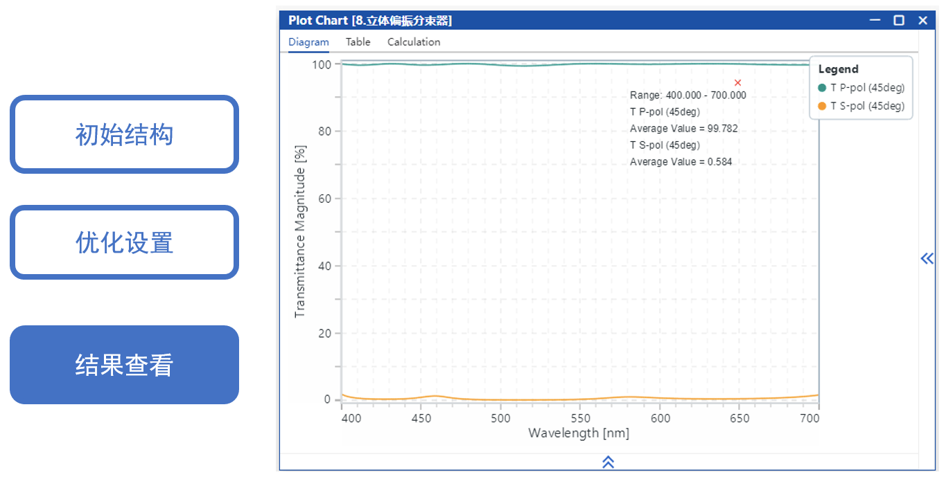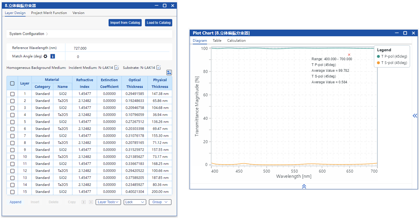 偏振分光立方是一種常用的光學元件,由兩個等邊直角棱鏡組成,透射面之間鍍有偏振分光膜,用于按偏振狀態將入射光學分成兩束互相垂直的光。本案例中,設計了一種偏振使用的分光膜能夠在可見光波段、45°入射條件下p偏振光大部分透射,s偏振光大部分反射。