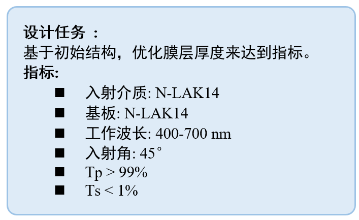 設計一款用于立方體型偏振分光器的薄膜結構,在45°入射條件下,于可見光波段實現優異的偏振分光性能:p偏振光的平均透過率大于99%,s偏振光的平均透過率小于1%。