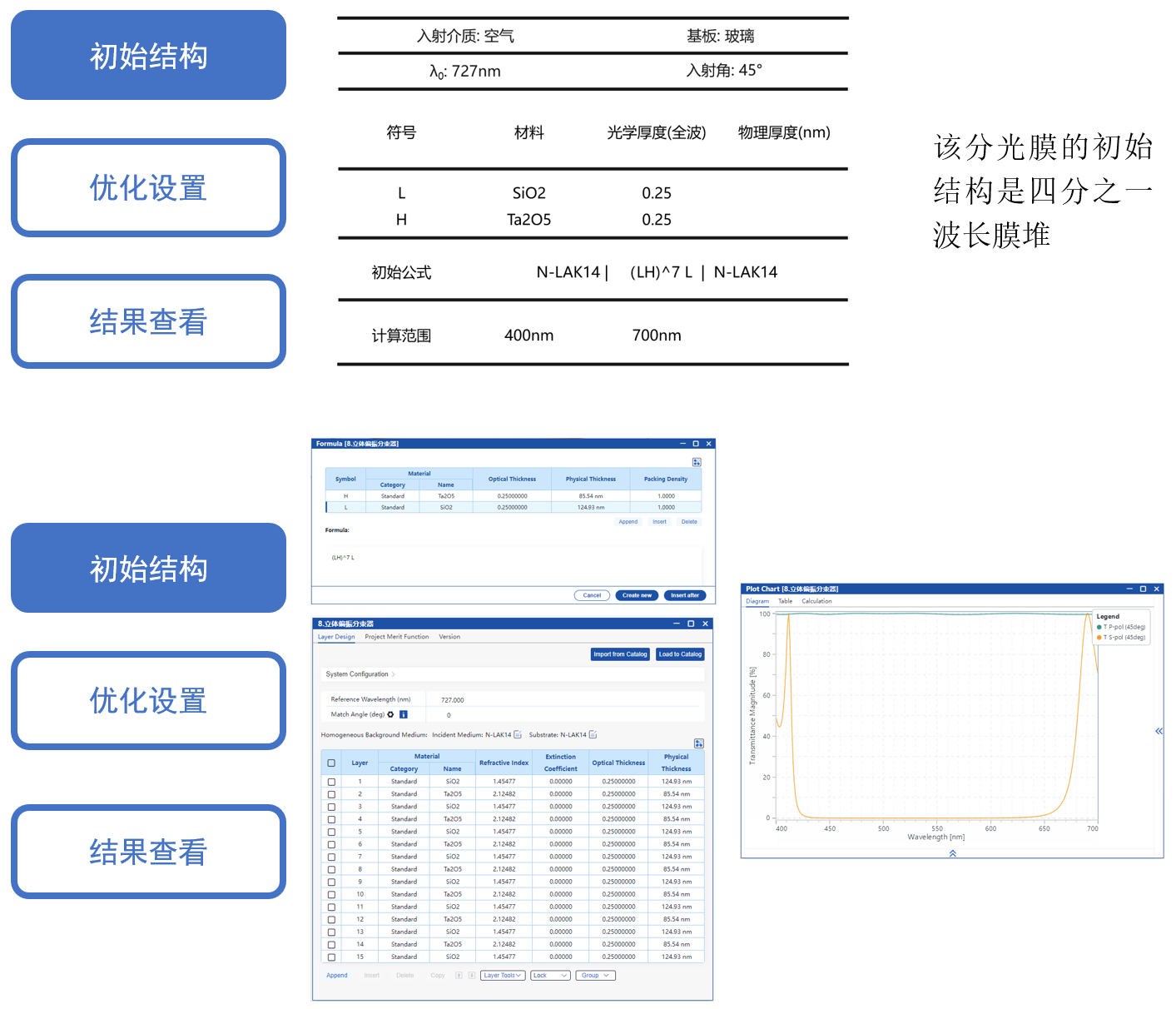上述膜系由公式工具構建得到,右圖為其在400–700 nm范圍內、45°入射條件下的光譜曲線。可以觀察到,s偏振光在波段兩端(約400 nm與700 nm附近)的透射率明顯升高,不符合設定的分光要求。