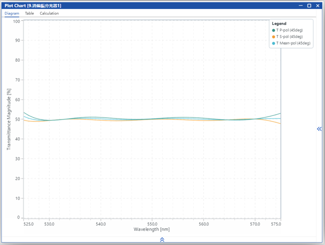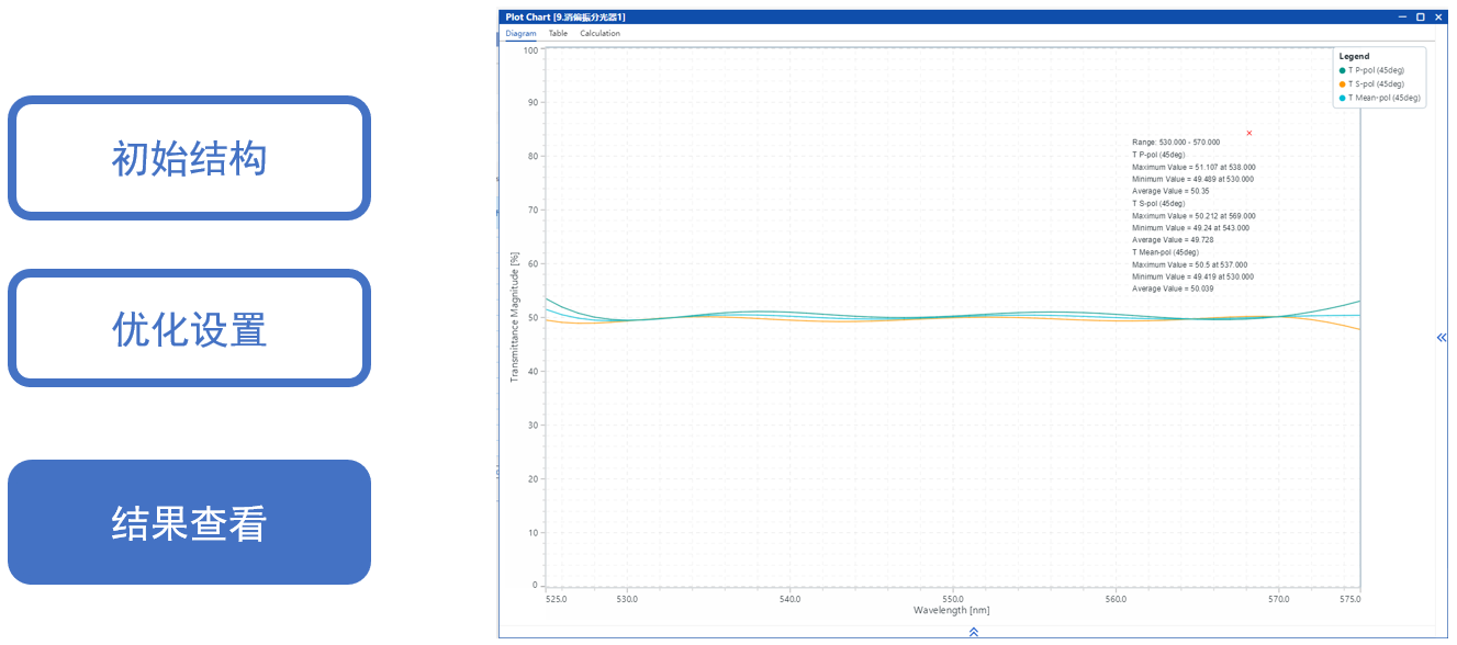 本案例中,成功實現了一種在530 nm-570 nm波長、45°入射條件下具有 50:50 分束比的消偏振分光膜。