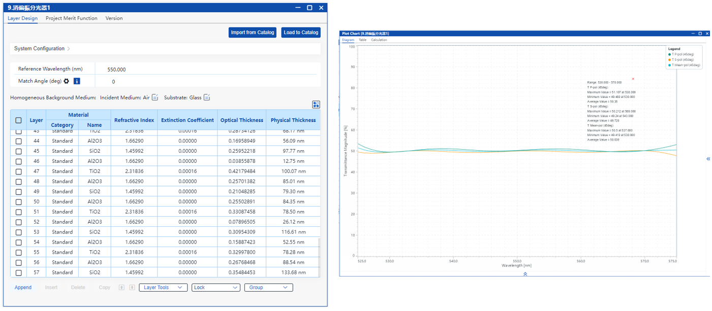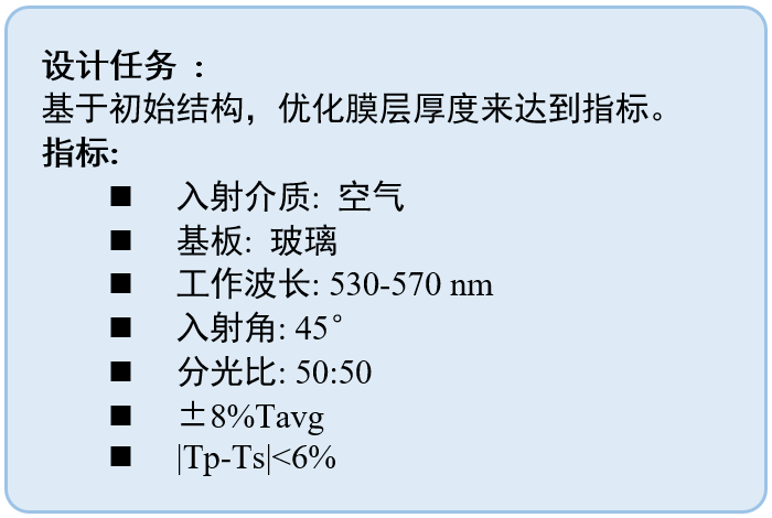 設計一款消偏振分光膜,在45°入射條件下,于530–570 nm波段實現50:50的分光比。要求該波段內的平均透射率偏差不超過±8%,且p光與s光的平均透射率之差的絕對值小于6%。