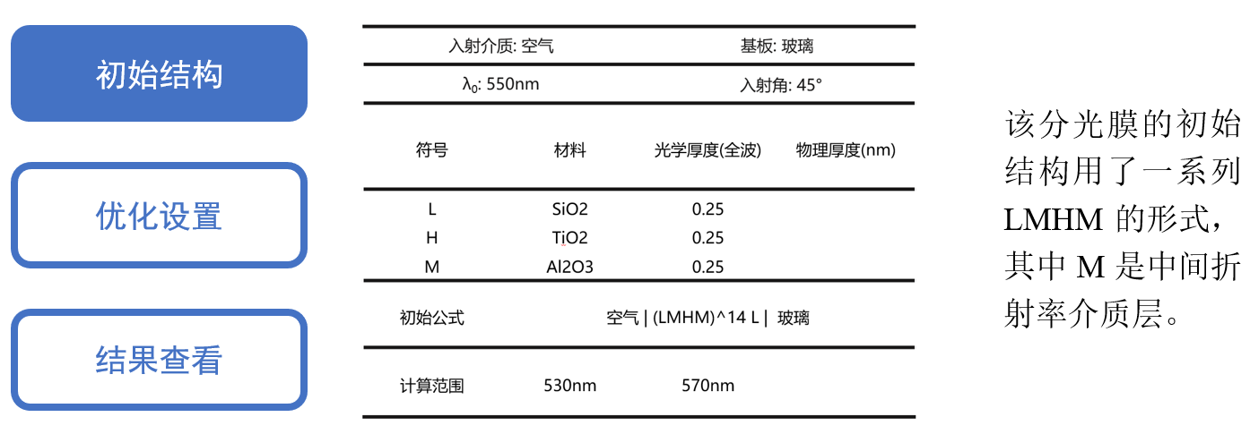 該分光膜的初始結構用了一系列LMHM的形式,其中M是中間折射率介質層。