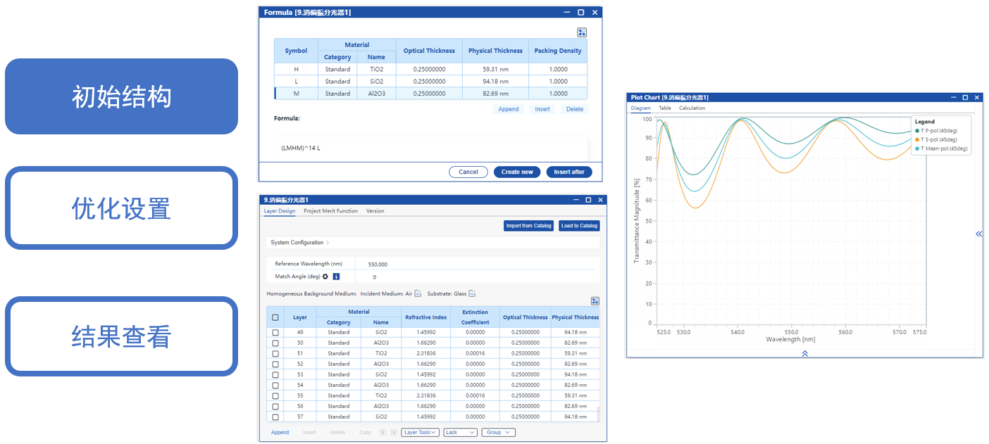 使用公式工具構建了上述膜系作為基礎結構,右圖展示了其在525 nm-575 nm范圍內45°入射時的光譜。可以看出此時不達標。