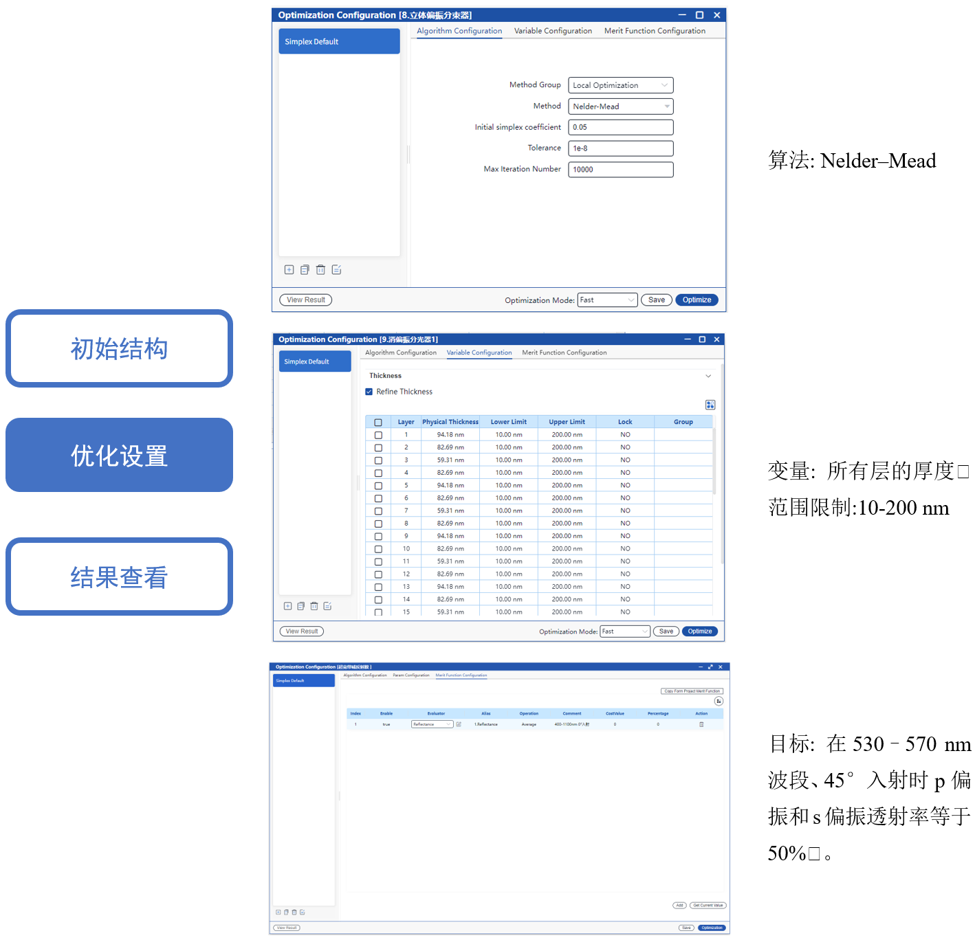 采用 Nelder-Mead 算法對各層厚度進行優化,目標是在 530–570 nm 波長范圍內、45° 入射時將p光和s光的透射率等于50%。