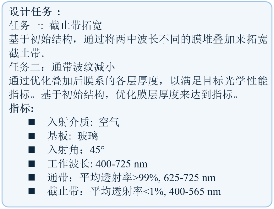 設計一個反射型青色二向色濾光膜,目標是在45°入射時,625-725 nm通帶內平均透射率>99%,在400-565 nm截止帶內平均透射率<1%.