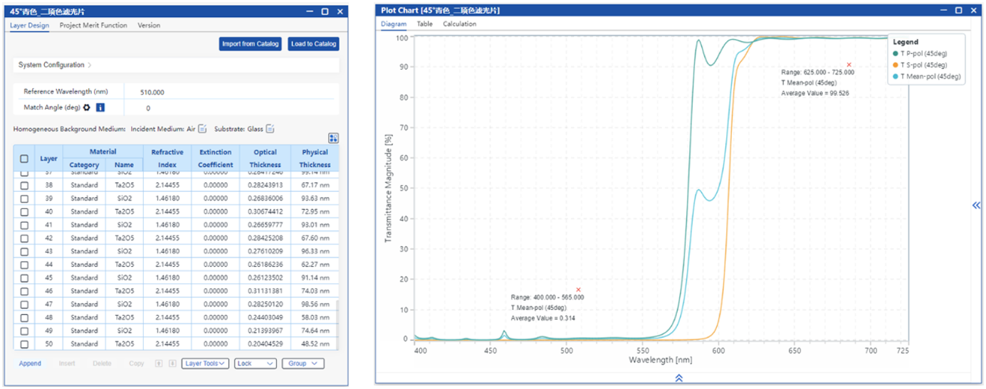 本案例展示了一個專為45°入射條件設計的反射型二向色性青色濾光膜。該膜系能夠有效反射藍綠波段的光,同時透過紅光,使其在反射視角下呈現青色效果。