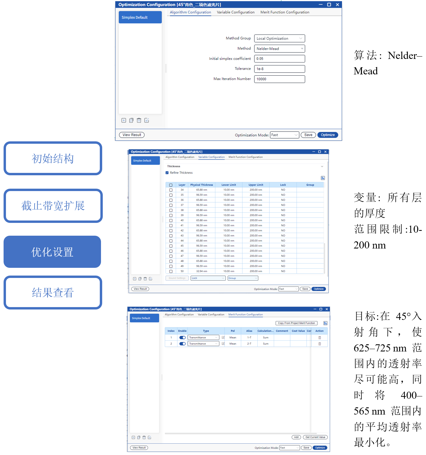 通過 Nelder-Mead 算法優化所有層的厚度,目標是在45°入射角下,使625–725 nm范圍內的透射率盡可能高,同時將400–565 nm范圍內的平均透射率最小化。
