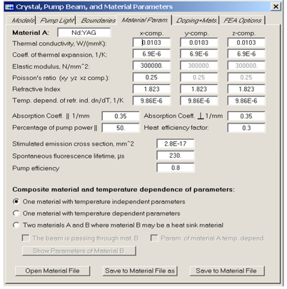 “absorption coefficient”描述由于泵浦光的吸收,泵浦光按 呈指數(shù)衰減,它也與摻雜濃度有關(guān)系。各向異性的晶體對(duì)泵浦光的吸收還與泵浦光的偏振態(tài)有關(guān),這種情況下的吸收因子可以定義為兩個(gè)獨(dú)立的偏振方向。更詳細(xì)的描述請(qǐng)參閱LASCAD 手冊(cè)的附錄部分。對(duì)Nd:YAG晶體,只需要輸入相等的值到相應(yīng)的對(duì)話(huà)框。