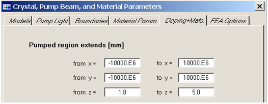 在現(xiàn)在這個(gè)例子中,我們用輸入框定義端蓋未摻雜的棒的泵浦區(qū)域范圍[mm]from z=1.0 to z=5.0意思是說(shuō),泵浦光只有在1 ≤ z ≤ 5 mm這個(gè)摻雜區(qū)域才被吸收。由于我們例子里使用的晶體是6mm長(zhǎng),我們定義兩非摻雜端蓋為1mm長(zhǎng)。