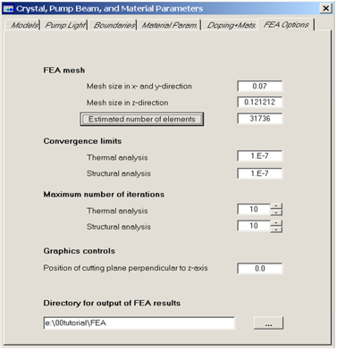 對(duì)話(huà)框“Convergence limits”用來(lái)控制迭代計(jì)算程序的收斂性。對(duì)熱分析情況,默認(rèn)值為1.0E-7時(shí)如果最高溫度的前7位沒(méi)有變化,代碼將停止運(yùn)行。對(duì)結(jié)構(gòu)分析的限制是最大節(jié)點(diǎn)位移的絕對(duì)溫度值。如果最大迭代次數(shù)超過(guò)“Maximum number of iterations”對(duì)話(huà)窗口中設(shè)置的次數(shù),不論其收斂性如何,迭代程序?qū)⑼V埂T趯?duì)話(huà)框“Directory for output of FEA results”中可以定義生成的FEA代碼文件的保存路徑,默認(rèn)的路徑是工作路徑的子路徑LascadFEA。