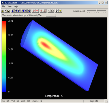 點(diǎn)擊LASCAD主菜單選擇“FEA/3D Visualizer”命令來(lái)顯示FEA結(jié)果的3D圖形,這是一個(gè)基于OpenGL的易于操控的三維觀察器。圖9顯示了一個(gè)溫度分布的3D圖形。由于在2.5節(jié)中定義了端面非摻雜,因此溫度上升限制在棒的內(nèi)區(qū)域。