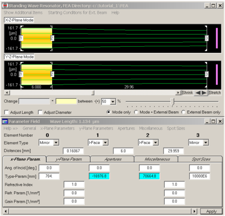 可以通過(guò)“Parameter Field”窗口中“Type-Param”對(duì)話(huà)框的參數(shù)來(lái)改變端面透鏡的曲率。也可以這樣改變?cè)膮?shù):?jiǎn)螕?ldquo;Parameter Field”窗口中的任意對(duì)話(huà)框,然后拖動(dòng)“Standing Wave Resonator”窗口下方的滑動(dòng)條,就可以相應(yīng)改變這個(gè)對(duì)話(huà)框中的數(shù)據(jù)。這種方法在使用手冊(cè)和快速入門(mén)中都有描述。