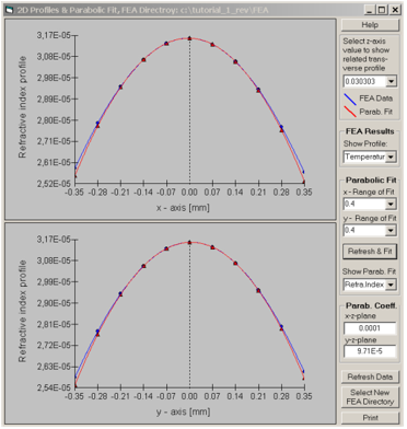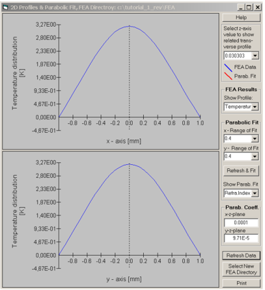 再次,可以使用窗口右上角的下拉框顯示沿z軸的擬合位置,擬合區(qū)域的拋物線(xiàn)因子在“Parab.Coeff”對(duì)話(huà)框顯示。另外,這些因子被寫(xiě)到“FIT.dat”文件中并保存在FEA子目錄下。