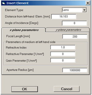 可以在對(duì)話(huà)框中定義元件類(lèi)型,比如焦距、曲率半徑等等。如果要?jiǎng)h除某個(gè)元件,按下CTRL 鍵的同時(shí)用鼠標(biāo)指向需要?jiǎng)h除的元件后按下左鍵,這時(shí)會(huì)彈出一個(gè)消息框,單擊確定就刪除了指向的那個(gè)元件。用這樣的方法,熱透鏡同樣可以刪除。
