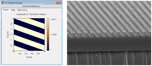 左圖:基于VirtualLab Fusion設計的傾斜光柵折射率分布;右圖:加工所得的傾斜光柵