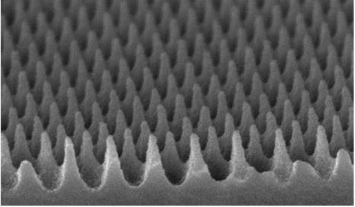蛾眼結構可以減少反射率,原因在于:當材料表面納米結構尺度小于光波長時,光波無法辨認出該納米結構,而圓錐型的蛾眼結構可以使材料表面的折射率沿深度方向呈連續變化,從而減小折射率急劇變化所造成的反射。