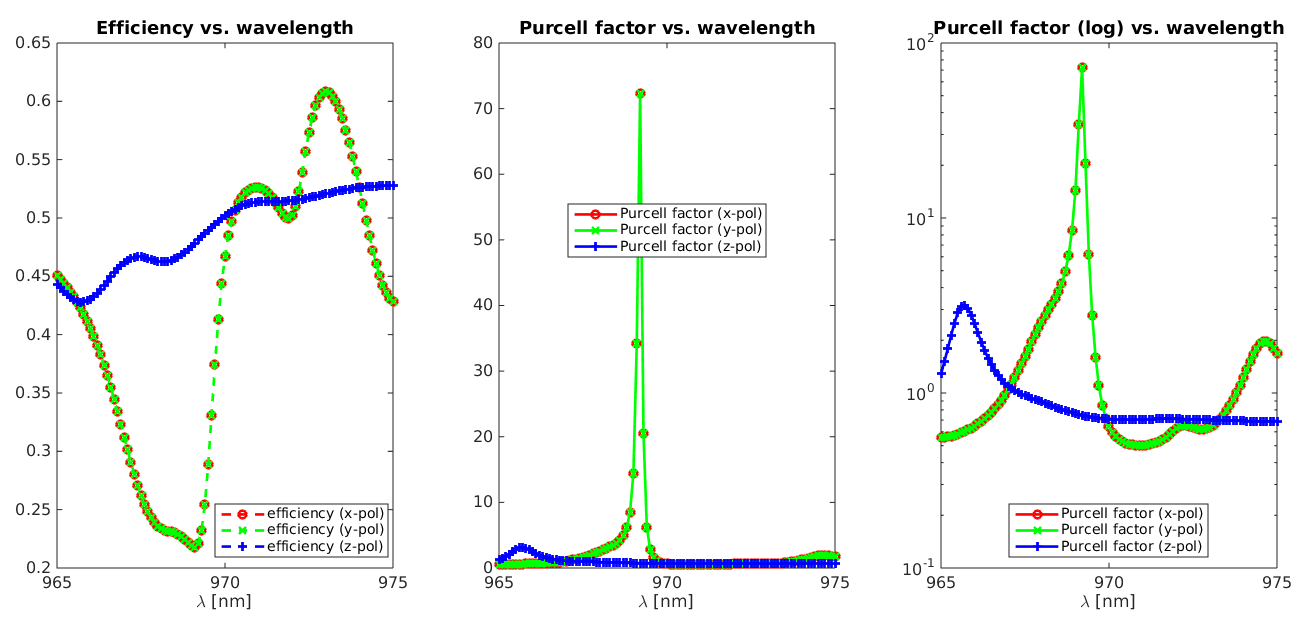 Matlab®腳本data_analysis/run_scan_wavelength.m對偶極子源的波長進行掃描并產生以下曲線,顯示了該設備的效率和Purcell因子(此處為直柱):