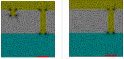 狹縫槽設置(左)和用于歸一化的狹縫設置(右)的三角形網(wǎng)格;灰色:銀膜,藍色:基板,紅色:檢測器區(qū)域,綠色:空氣;請注意金屬角處網(wǎng)格的預細化。