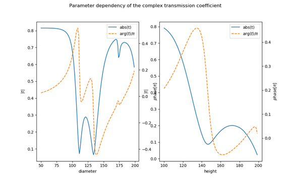 納米片半徑和高度的變化會(huì)影響相位和透射率。這個(gè)光譜特性使用腳本data_analysis/run_scan_geometry.py來(lái)研究。在這里,納米片的直徑和高度發(fā)生了變化,并記錄了相位和透射的變化。