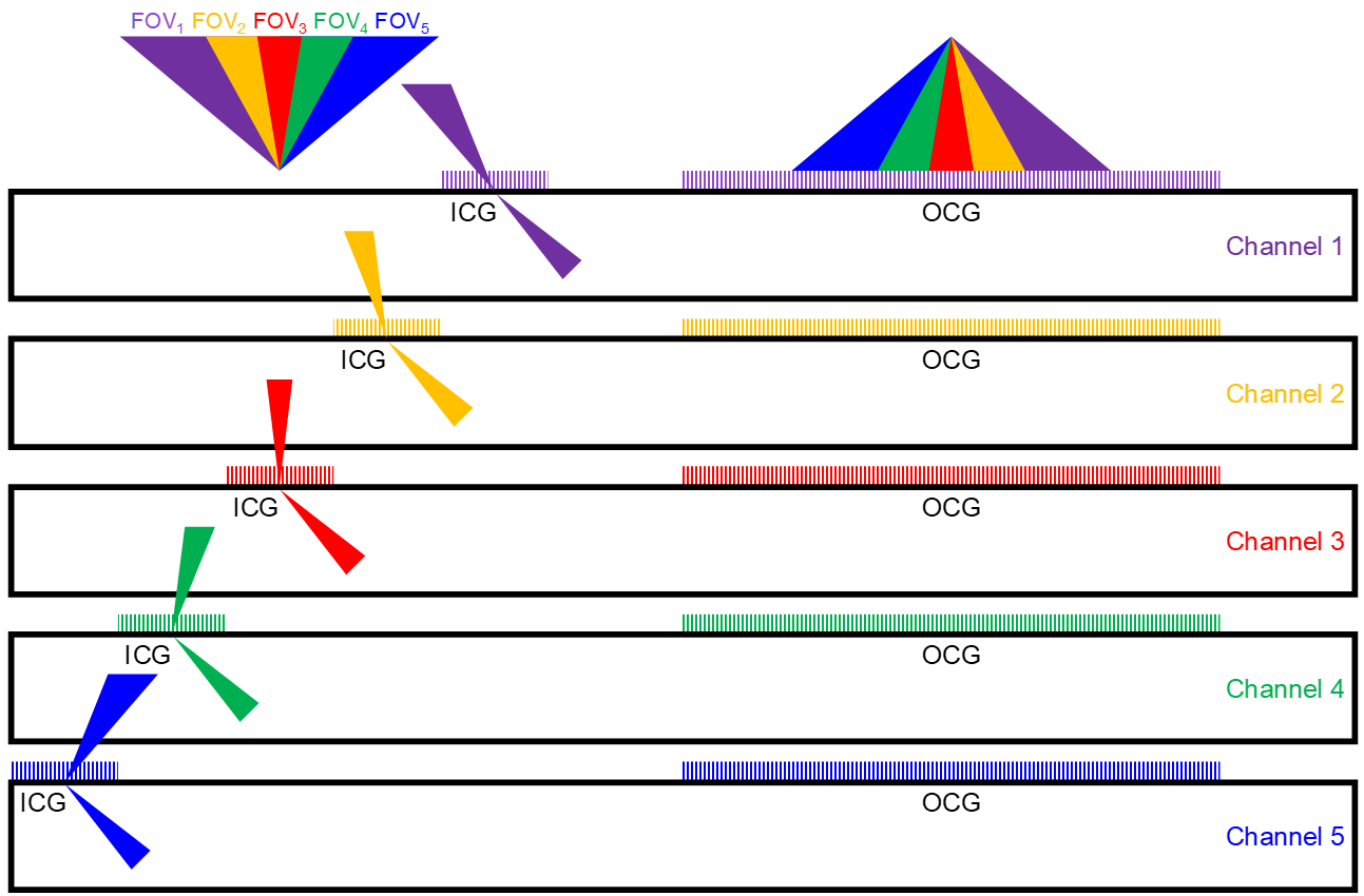 上海交通大學的智能顯示實驗室(sdl.sjtu.edu.cn),提出了一種基于五通道波導及二維擴瞳器的近眼顯示。如圖1所示,其基本架構由(1)五通道波導、(2)入耦合光柵(ICG)、(3)出耦合光柵(OCG)所組成。其核心設計思路為將通道1/2/3/4/5的入耦合光柵置于僅包含子視場1/2/3/4/5的獨立區域內,從而實現五通道的視場分割。與傳統波導相比,一個顯著特征是,五個入耦合光柵在位置上是錯開的。