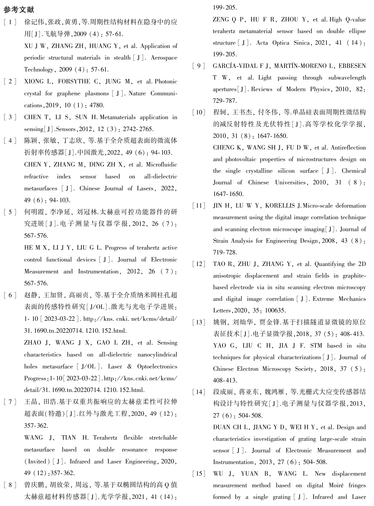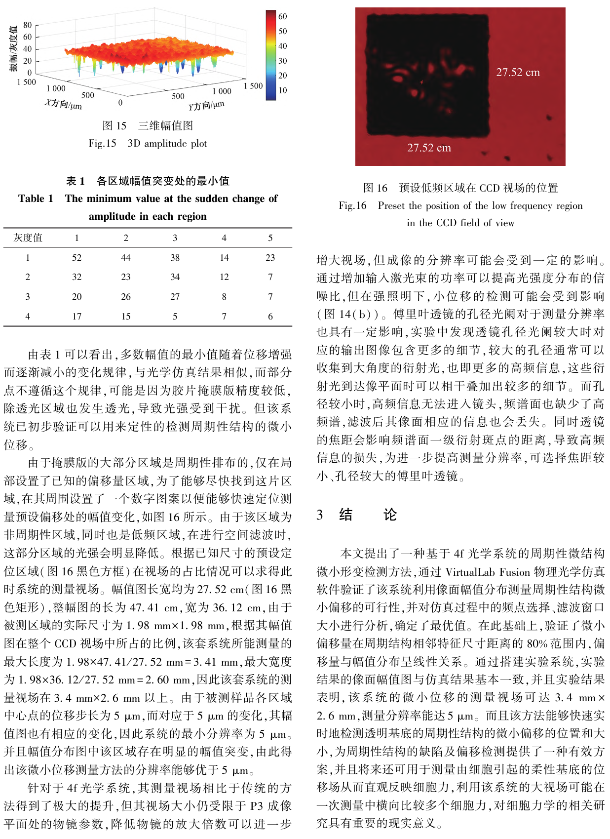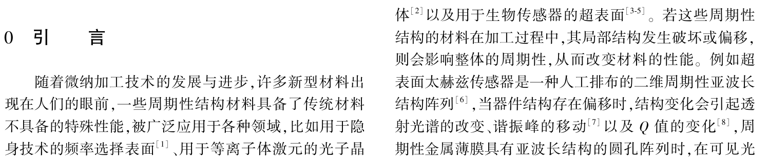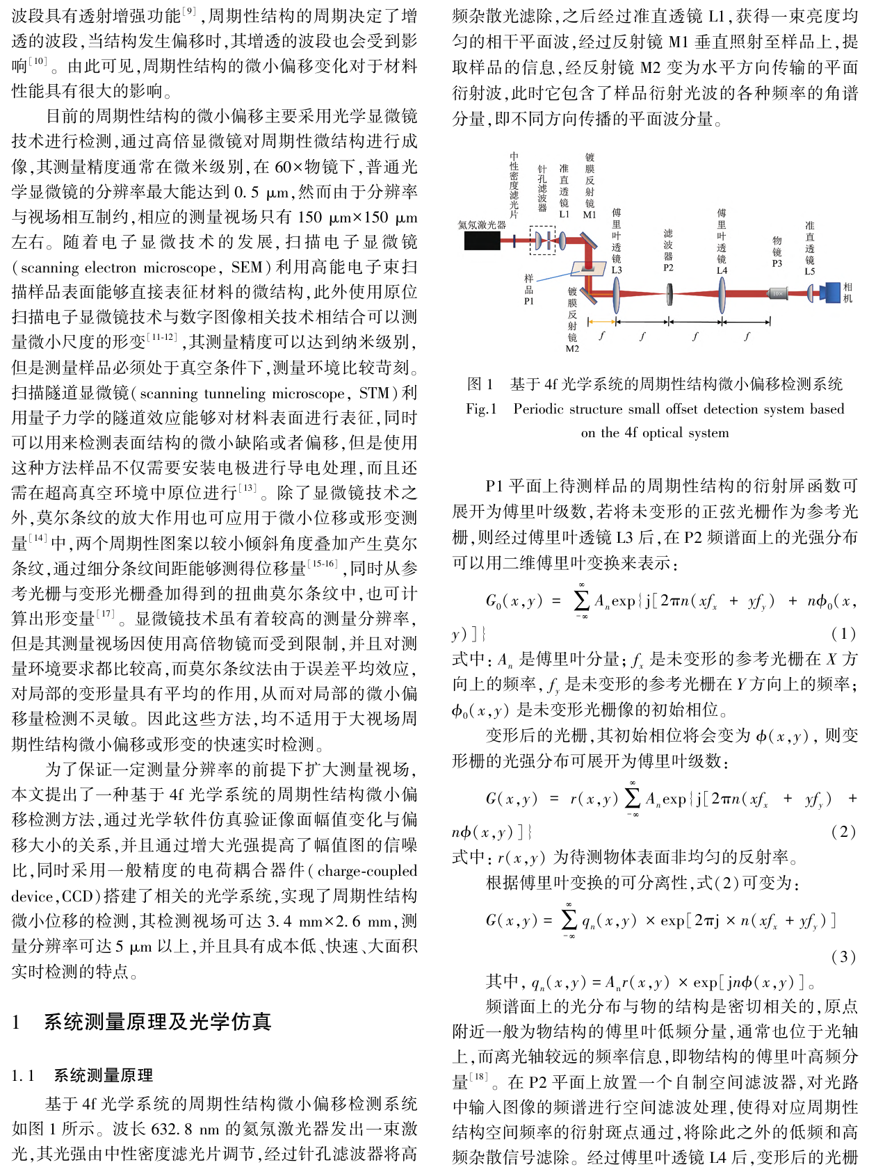 摘要:為了快速、直觀地檢測出周期性結構的微小偏移,提出了基于4f光學系統的周期性結構微小偏移檢測方法。 首先使用VirtualLab Fusion 光學仿真軟件進行理論研究,建立預設偏移的周期性微結構模型,構造了光學傳遞函數,利用4f空間濾波方法,獲得與周期性微結構對應的像面幅值圖。 經分析得出在透明基底的周期性結構中,不論尺寸大小,若偏移量在相鄰特征尺寸間距的80%范圍內,經擬合后幅值變化與微結構偏移量呈線性關系,且幅值變化位置與微結構偏移位置一致。 依據仿真的光學系統參數搭建了實驗系統,實驗結果與仿真一致,并且該套系統可以實現3.4mm×2.6mm的測量視場,分辨率能達5 μm,能夠實時快速地對周期性結構材料進行位移或缺陷檢測。